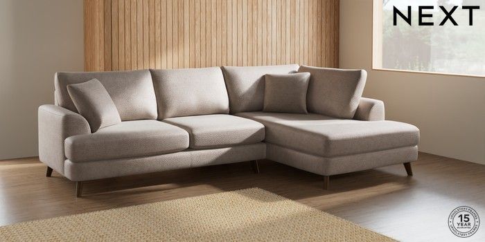 7.2.10 Parker Medium Corner Chaise - Right Hand Boucle Chenille Light Natural Low Retro Tapered - Mid | Made Click here to use our website with more accessibility support, for example screen readers