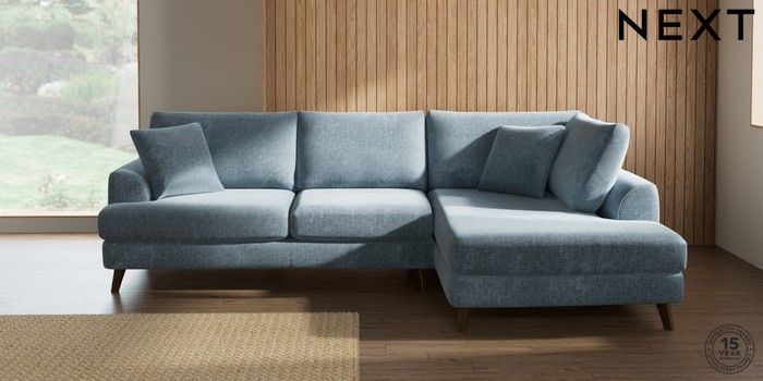7.2.10 Parker Medium Corner Chaise - Right Hand Plush Chenille Light Blue Low Retro Tapered - Mid | Made Click here to use our website with more accessibility support, for example screen readers