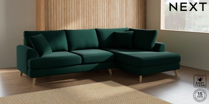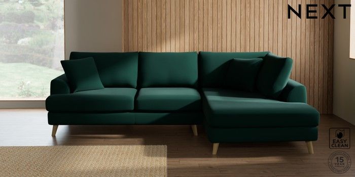 7.2.10 Parker Medium Corner Chaise - Right Hand Plush Velvet Easy Clean Bottle Green Low Retro Tapered - Light | Made Click here to use our website with more accessibility support, for example screen readers