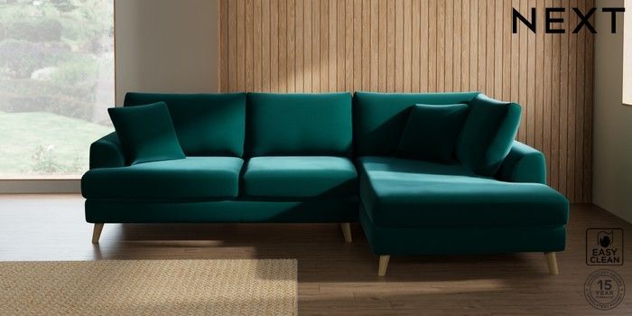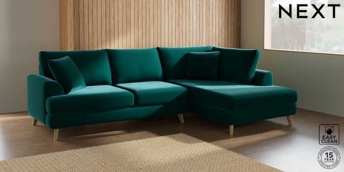 7.2.10 Parker Medium Corner Chaise - Right Hand Plush Velvet Easy Clean Juniper Green Low Retro Tapered - Light | Made Click here to use our website with more accessibility support, for example screen readers