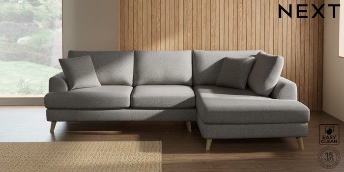 7.2.10 Parker Medium Corner Chaise - Right Hand Woven Chenille Easy Clean Light Grey Low Retro Tapered - Light | Made Click here to use our website with more accessibility support, for example screen readers