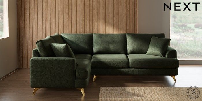 7.2.10 Parker Medium Corner Sofa - Left Hand Boucle Chenille Dark Moss Green High Metal - Brass | Made Click here to use our website with more accessibility support, for example screen readers