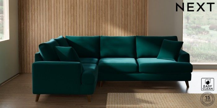 7.2.10 Parker Medium Corner Sofa - Left Hand Plush Velvet Easy Clean Juniper Green Low Retro Tapered - Mid | Made Click here to use our website with more accessibility support, for example screen readers