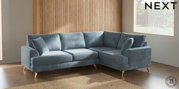 7.2.10 Parker Medium Corner Sofa - Right Hand Plush Chenille Light Blue High Metal - Brass | Made Click here to use our website with more accessibility support, for example screen readers