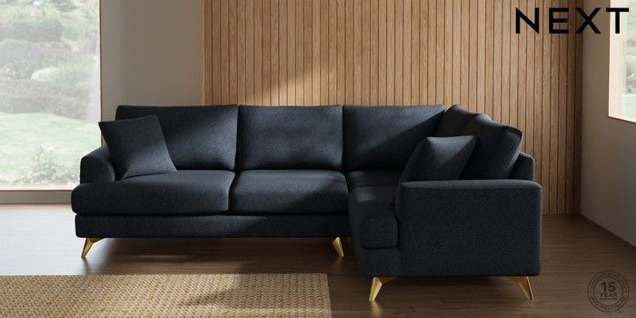7.2.10 Parker Medium Corner Sofa - Right Hand Tweedy Chenille Navy Blue High Metal - Brass | Made Click here to use our website with more accessibility support, for example screen readers