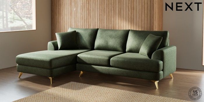 7.2.10 Parker Medium Sofa Chaise - Left Hand Boucle Chenille Dark Moss Green High Metal - Brass | Made Click here to use our website with more accessibility support, for example screen readers