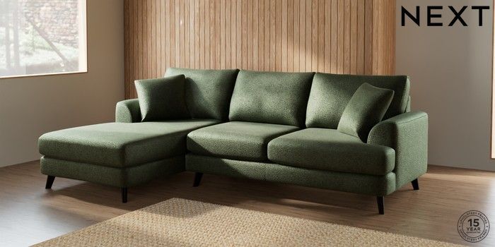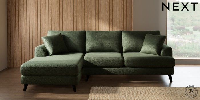 7.2.10 Parker Medium Sofa Chaise - Left Hand Boucle Chenille Dark Moss Green Low Retro Tapered - Dark | Made Click here to use our website with more accessibility support, for example screen readers