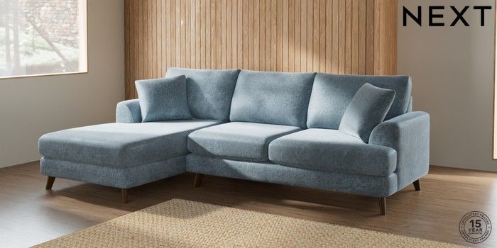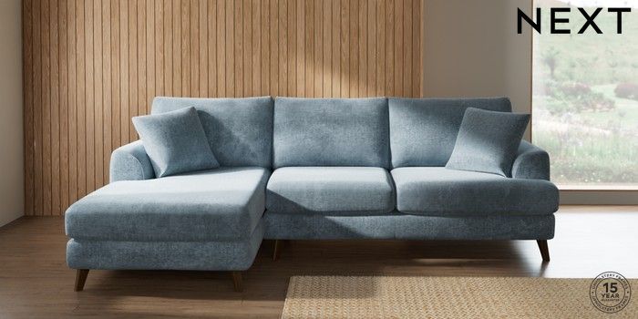 7.2.10 Parker Medium Sofa Chaise - Left Hand Plush Chenille Light Blue Low Retro Tapered - Mid | Made Click here to use our website with more accessibility support, for example screen readers