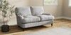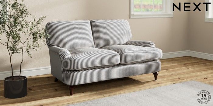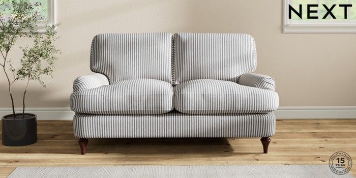 7.2.10 Sadie Deep Relaxed Sit 2 Seater Small Sofa Chenille Stripe Slate Blue High Slim Turned - Dark Brown | Made Click here to use our website with more accessibility support, for example screen readers