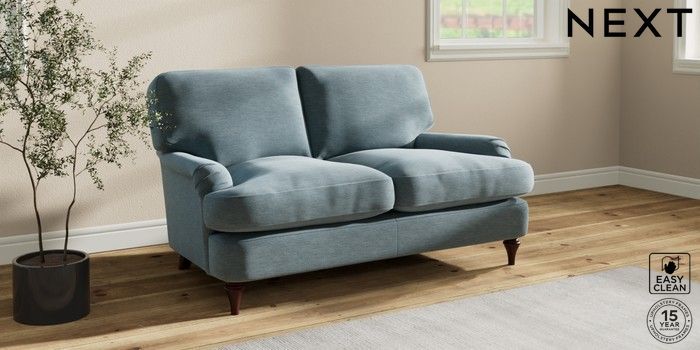7.2.10 Sadie Deep Relaxed Sit 2 Seater Small Sofa Fine Chenille Easy Clean Mid Blue High Slim Turned - Dark Brown | Made Click here to use our website with more accessibility support, for example screen readers