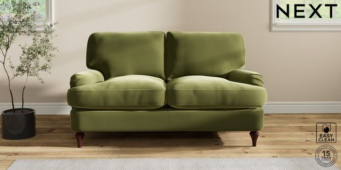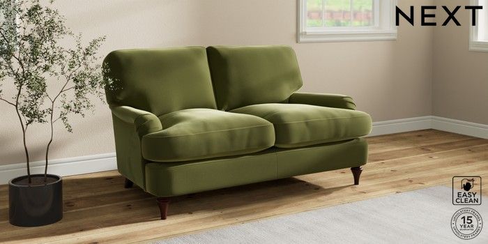7.2.10 Sadie Deep Relaxed Sit 2 Seater Small Sofa Plush Velvet Easy Clean Mid Olive Green High Slim Turned - Dark Brown | Made Click here to use our website with more accessibility support, for example screen readers