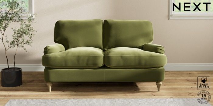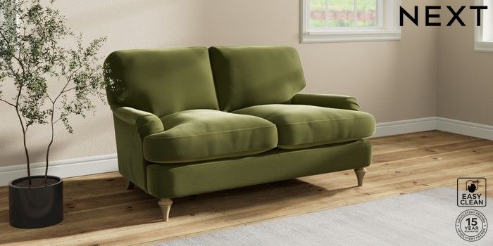 7.2.10 Sadie Deep Relaxed Sit 2 Seater Small Sofa Plush Velvet Easy Clean Mid Olive Green High Slim Turned - Light | Made Click here to use our website with more accessibility support, for example screen readers