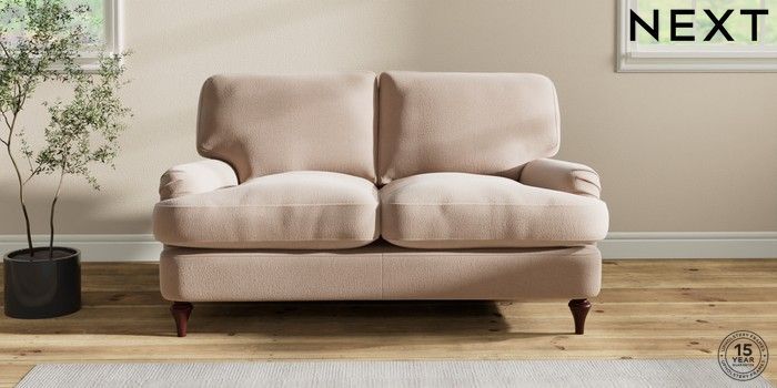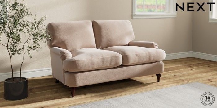 7.2.10 Sadie Deep Relaxed Sit 2 Seater Small Sofa Relaxed Linen Look Mid Natural High Slim Turned - Dark Brown | Made Click here to use our website with more accessibility support, for example screen readers