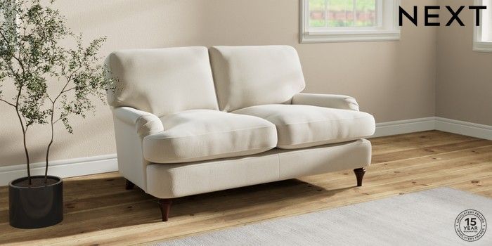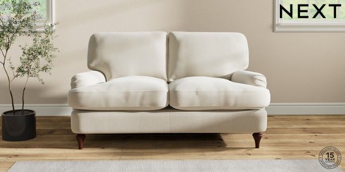 7.2.10 Sadie Deep Relaxed Sit 2 Seater Small Sofa Relaxed Linen Look Oyster High Slim Turned - Dark Brown | Made Click here to use our website with more accessibility support, for example screen readers
