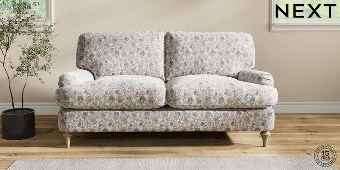 7.2.10 Sadie Deep Relaxed Sit 2 Seater Sofa Relaxed Linen Look Print Woodblock Floral Blue High Slim Turned - Light | Made Click here to use our website with more accessibility support, for example screen readers