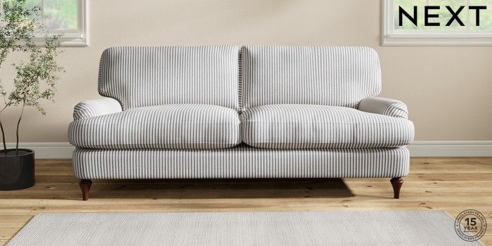 7.2.10 Sadie Deep Relaxed Sit 3 Seater Sofa Chenille Stripe Slate Blue High Slim Turned - Dark Brown | Made Click here to use our website with more accessibility support, for example screen readers