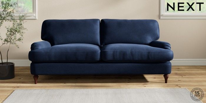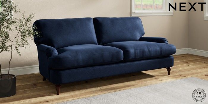 7.2.10 Sadie Deep Relaxed Sit 3 Seater Sofa Luxe Chenille Navy Blue High Slim Turned - Dark Brown | Made Click here to use our website with more accessibility support, for example screen readers