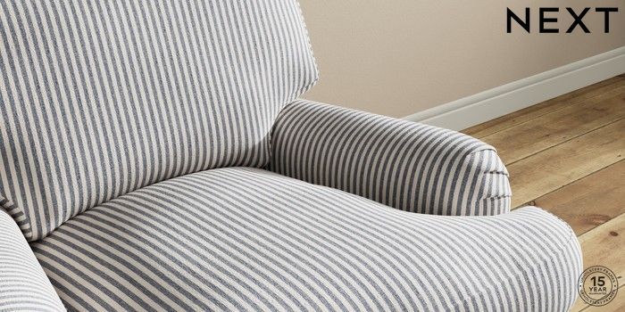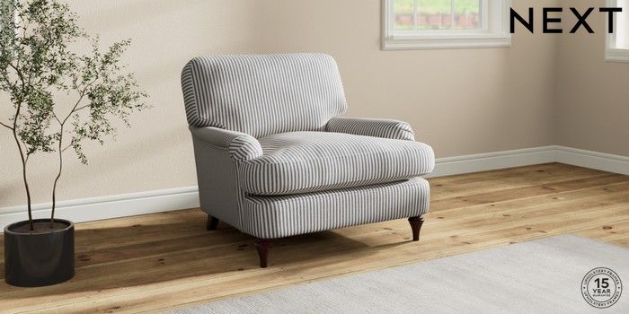 7.2.10 Sadie Deep Relaxed Sit Armchair Chenille Stripe Slate Blue High Slim Turned - Dark Brown | Made Click here to use our website with more accessibility support, for example screen readers
