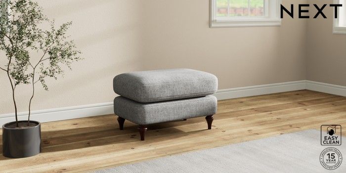 7.2.10 Sadie Deep Relaxed Sit Footstool Chunky Boucle Easy Clean Light Grey High Slim Turned - Dark Brown | Made Click here to use our website with more accessibility support, for example screen readers