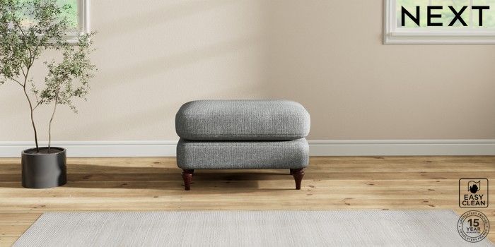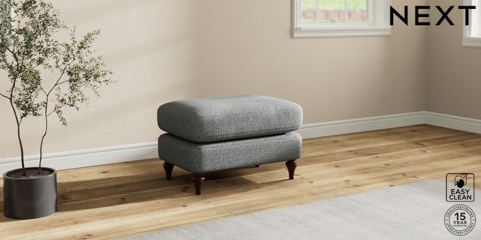 7.2.10 Sadie Deep Relaxed Sit Footstool Chunky Boucle Easy Clean Mid Grey High Slim Turned - Dark Brown | Made Click here to use our website with more accessibility support, for example screen readers