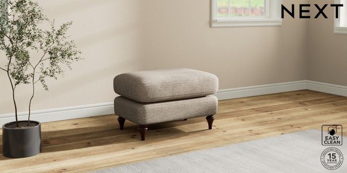 7.2.10 Sadie Deep Relaxed Sit Footstool Chunky Boucle Easy Clean Mid Natural High Slim Turned - Dark Brown | Made Click here to use our website with more accessibility support, for example screen readers