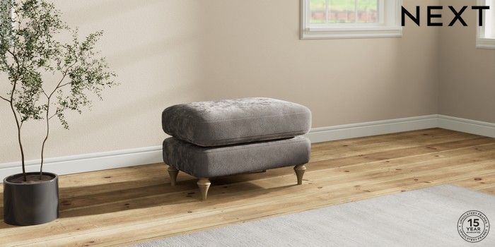 7.2.10 Sadie Deep Relaxed Sit Footstool Distressed Velour French Grey High Slim Turned - Light | Made Click here to use our website with more accessibility support, for example screen readers