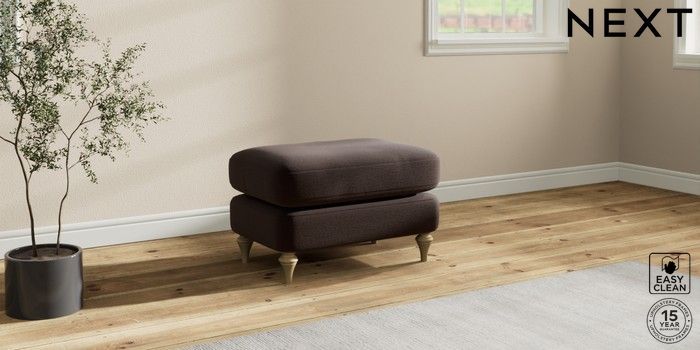 7.2.10 Sadie Deep Relaxed Sit Footstool Fine Chenille Easy Clean Chocolate Brown High Slim Turned - Light | Made Click here to use our website with more accessibility support, for example screen readers