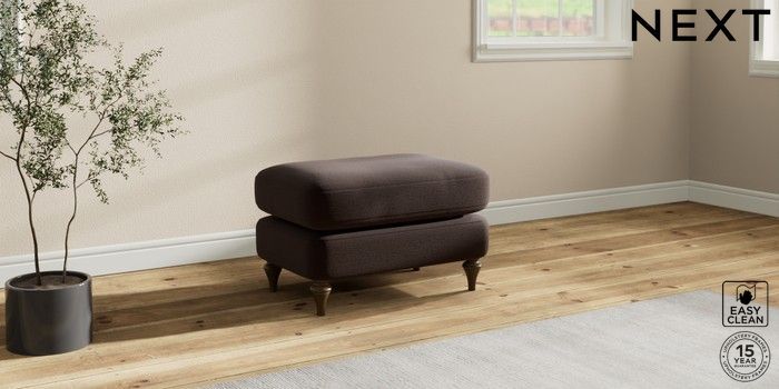 7.2.10 Sadie Deep Relaxed Sit Footstool Fine Chenille Easy Clean Chocolate Brown High Slim Turned - Mid | Made Click here to use our website with more accessibility support, for example screen readers