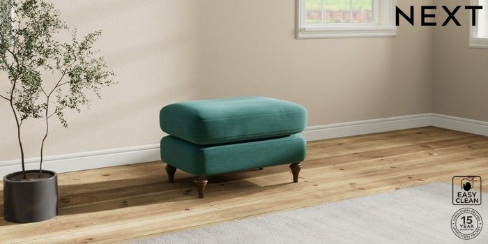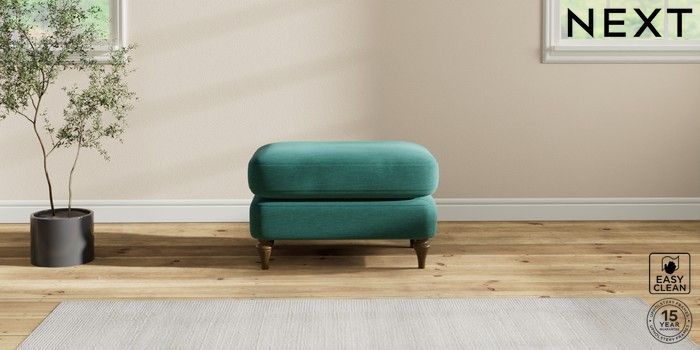 7.2.10 Sadie Deep Relaxed Sit Footstool Fine Chenille Easy Clean Dark Juniper Green High Slim Turned - Mid | Made Click here to use our website with more accessibility support, for example screen readers