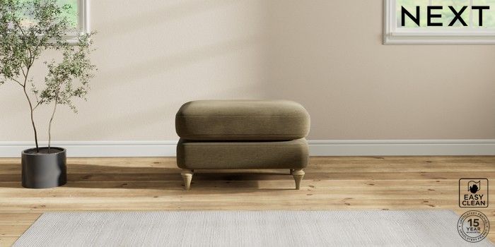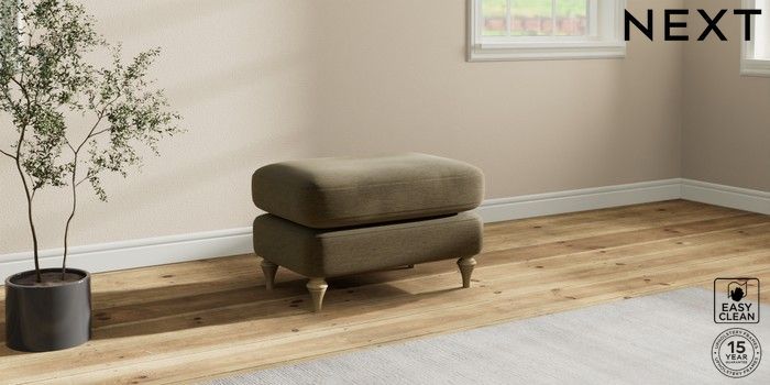 7.2.10 Sadie Deep Relaxed Sit Footstool Fine Chenille Easy Clean Dark Moss Green High Slim Turned - Light | Made Click here to use our website with more accessibility support, for example screen readers