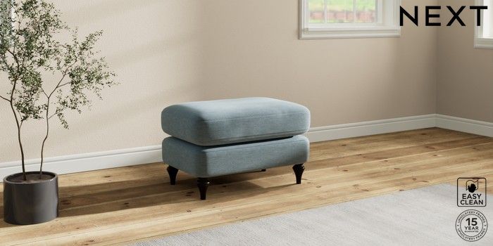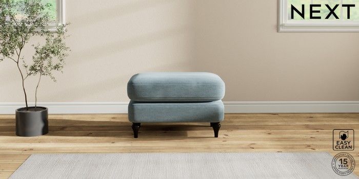 7.2.10 Sadie Deep Relaxed Sit Footstool Fine Chenille Easy Clean Mid Blue High Slim Turned - Dark | Made Click here to use our website with more accessibility support, for example screen readers