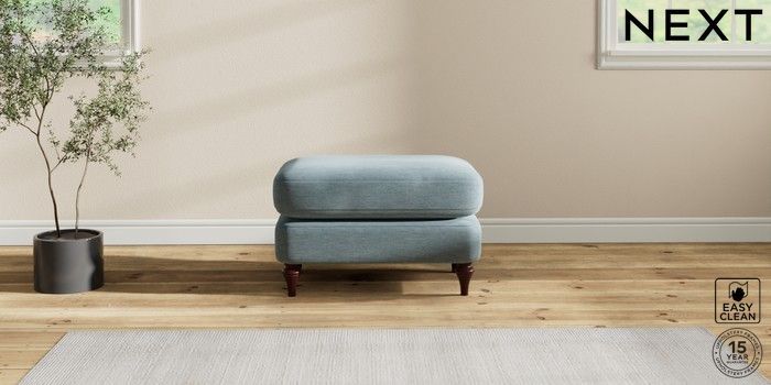 7.2.10 Sadie Deep Relaxed Sit Footstool Fine Chenille Easy Clean Mid Blue High Slim Turned - Dark Brown | Made Click here to use our website with more accessibility support, for example screen readers