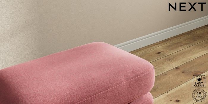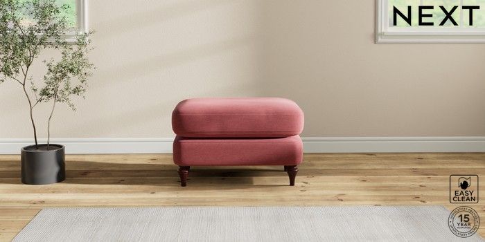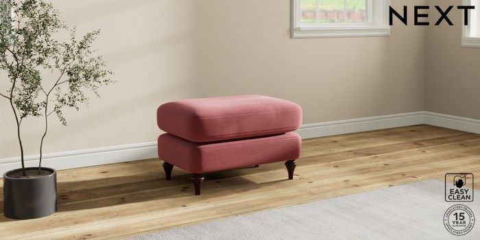 7.2.10 Sadie Deep Relaxed Sit Footstool Fine Chenille Easy Clean Mid Pink High Slim Turned - Dark Brown | Made Click here to use our website with more accessibility support, for example screen readers