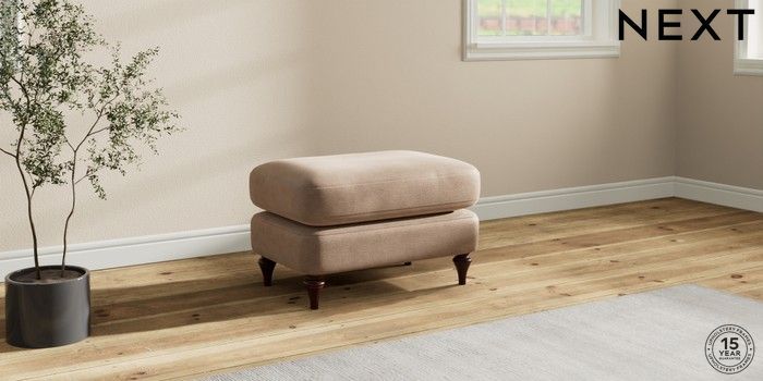 7.2.10 Sadie Deep Relaxed Sit Footstool Luxe Chenille Mid Natural High Slim Turned - Dark Brown | Made Click here to use our website with more accessibility support, for example screen readers