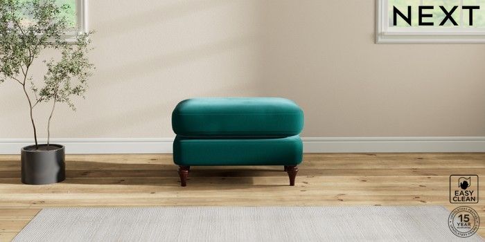 7.2.10 Sadie Deep Relaxed Sit Footstool Plush Velvet Easy Clean Juniper Green High Slim Turned - Dark Brown | Made Click here to use our website with more accessibility support, for example screen readers