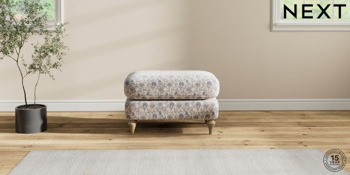 7.2.10 Sadie Deep Relaxed Sit Footstool Relaxed Linen Look Print Woodblock Floral Blue High Slim Turned - Light | Made Click here to use our website with more accessibility support, for example screen readers