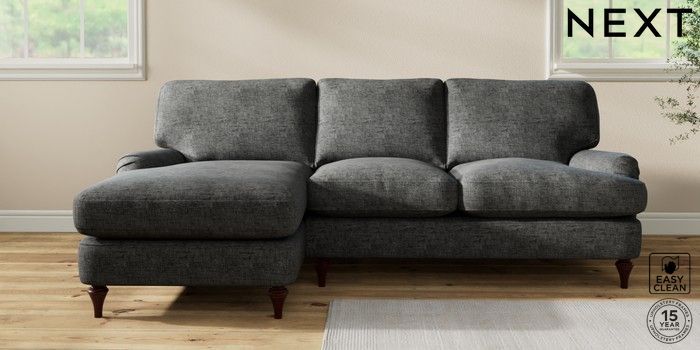 7.2.10 Sadie Deep Relaxed Sit Medium Sofa Chaise - Left Hand Boucle Weave Easy Clean Charcoal Grey High Slim Turned - Dark Brown | Made Click here to use our website with more accessibility support, for example screen readers