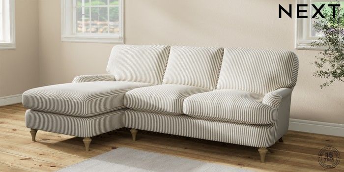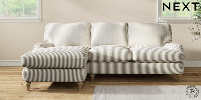 7.2.10 Sadie Deep Relaxed Sit Medium Sofa Chaise - Left Hand Chenille Stripe Moss Green High Slim Turned - Light | Made Click here to use our website with more accessibility support, for example screen readers