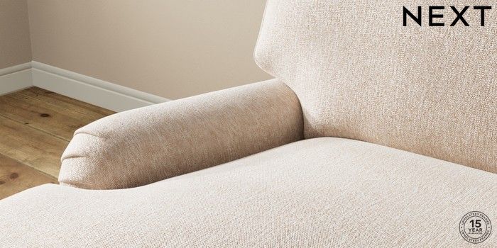 7.2.10 Sadie Deep Relaxed Sit Medium Sofa Chaise - Left Hand Cotswold Chenille Light Natural High Slim Turned - Dark Brown | Made Click here to use our website with more accessibility support, for example screen readers