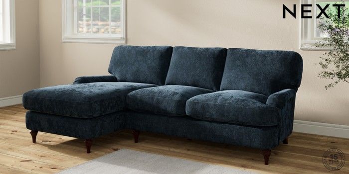 7.2.10 Sadie Deep Relaxed Sit Medium Sofa Chaise - Left Hand Distressed Velour Midnight Blue High Slim Turned - Dark Brown | Made Click here to use our website with more accessibility support, for example screen readers