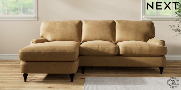 7.2.10 Sadie Deep Relaxed Sit Medium Sofa Chaise - Left Hand Luxe Chenille Honey Yellow High Slim Turned - Dark | Made Click here to use our website with more accessibility support, for example screen readers