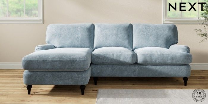 7.2.10 Sadie Deep Relaxed Sit Medium Sofa Chaise - Left Hand Plush Chenille Light Blue High Slim Turned - Dark | Made Click here to use our website with more accessibility support, for example screen readers