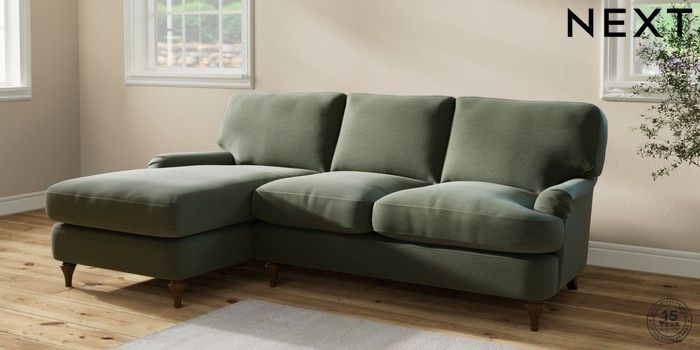 7.2.10 Sadie Deep Relaxed Sit Medium Sofa Chaise - Left Hand Relaxed Linen Look Dark Green High Slim Turned - Mid | Made Click here to use our website with more accessibility support, for example screen readers