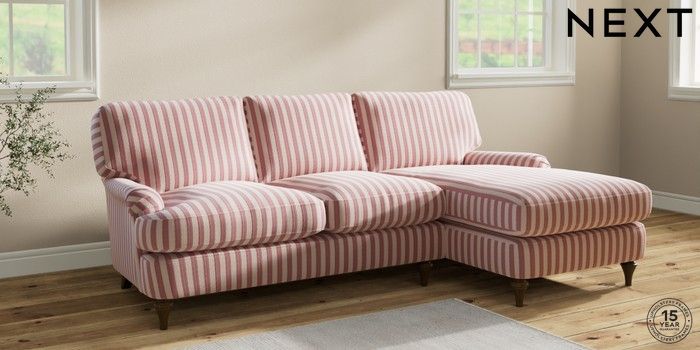 7.2.10 Sadie Deep Relaxed Sit Medium Sofa Chaise - Right Hand Bold Chenille Stripe Dark Pink High Slim Turned - Mid | Made Click here to use our website with more accessibility support, for example screen readers