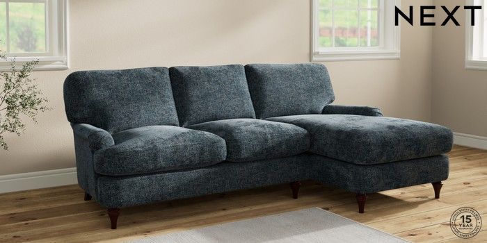 7.2.10 Sadie Deep Relaxed Sit Medium Sofa Chaise - Right Hand Chunky Chenille Dark Navy Blue High Slim Turned - Dark Brown | Made Click here to use our website with more accessibility support, for example screen readers
