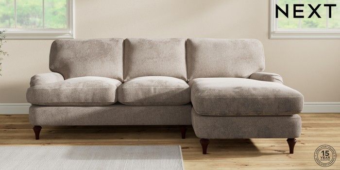 7.2.10 Sadie Deep Relaxed Sit Medium Sofa Chaise - Right Hand Chunky Chenille Light Dove High Slim Turned - Dark Brown | Made Click here to use our website with more accessibility support, for example screen readers