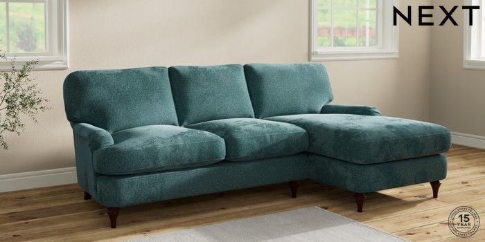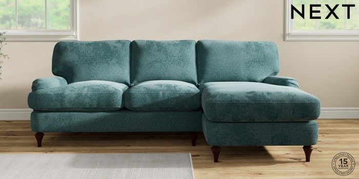 7.2.10 Sadie Deep Relaxed Sit Medium Sofa Chaise - Right Hand Chunky Chenille Mid Teal Green High Slim Turned - Dark Brown | Made Click here to use our website with more accessibility support, for example screen readers