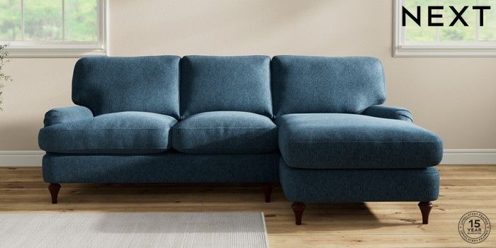 7.2.10 Sadie Deep Relaxed Sit Medium Sofa Chaise - Right Hand Cotswold Chenille Dark Blue High Slim Turned - Dark Brown | Made Click here to use our website with more accessibility support, for example screen readers