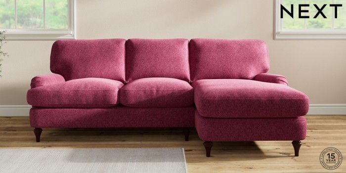 7.2.10 Sadie Deep Relaxed Sit Medium Sofa Chaise - Right Hand Cotswold Chenille Dark Raspberry Pink High Slim Turned - Dark Brown | Made Click here to use our website with more accessibility support, for example screen readers