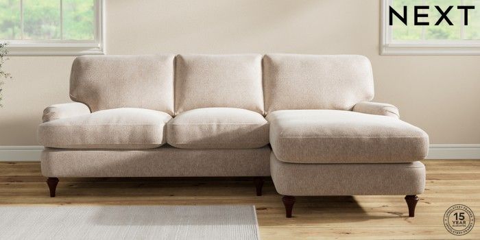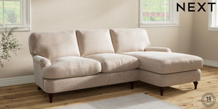 7.2.10 Sadie Deep Relaxed Sit Medium Sofa Chaise - Right Hand Cotswold Chenille Light Natural High Slim Turned - Dark Brown | Made Click here to use our website with more accessibility support, for example screen readers